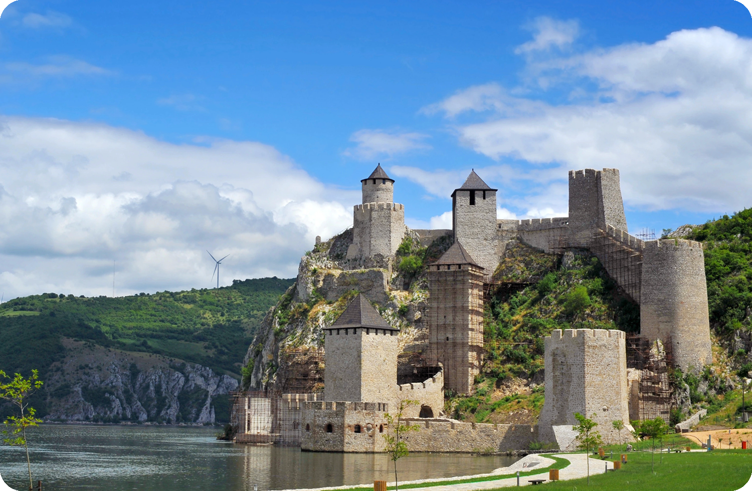 The Golubac fortress was built at the very entrance to the Djerdap Gorge, at the point where the Danube, widest in its stream, enter into the gorge of the Carpathian Mountains. For the first time in historical sources, the Golubac fortress is mentioned in 1335 as a fortress with a Hungarian military crew. Although it was founded before the mentioned year, it is not known who built it and when exactly. Its name on medieval maps is written in different languages: Galambas, Galambocz, Colombazo, Columbaz, Columbarum, Taubersburg, Tawbenstein, Peristerin, Giwerdzinlik etc. and in each base it forms the word - golub (dove).